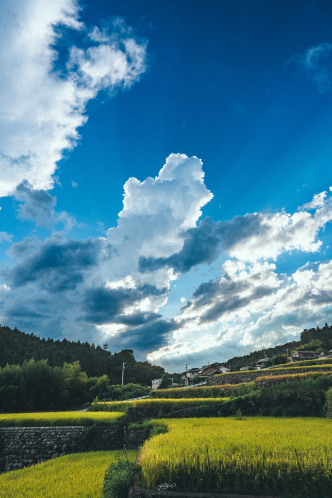 よく実った稲穂と、入道雲が映える夏空。その風景はどこか懐かしく、訪れる人をノスタルジーの世界へと誘います。