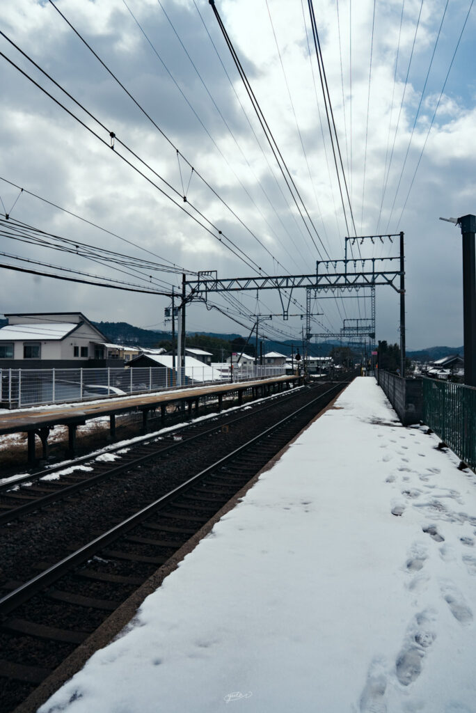 前置きが長くなりましたが、その翌日に名張の赤目口駅周辺を撮影してきました。当初は積雪はまったく期待していませんでした。なぜなら時刻が12:00を過ぎていて気温も4度ぐらいだったので溶けていると思っていたからです。