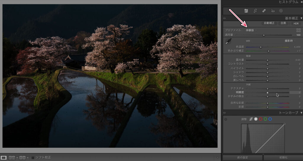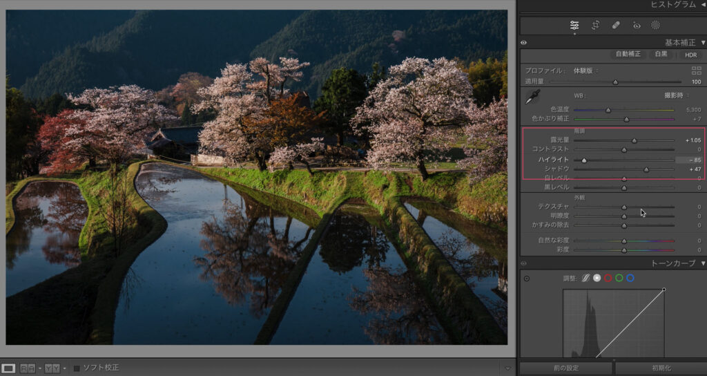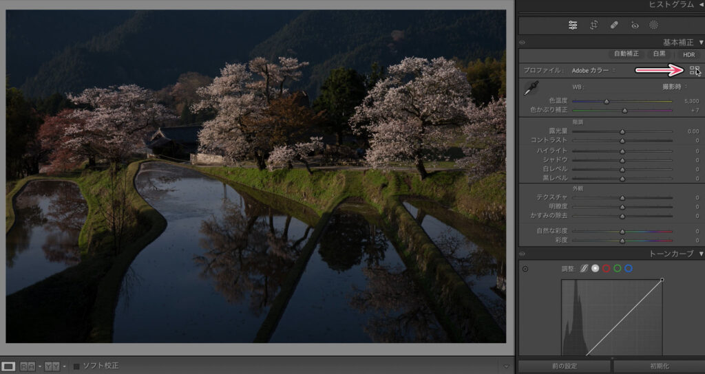 ここからは基本補正で明るさを整えていきます。