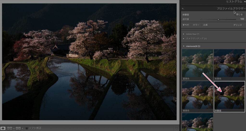 ダウンロードしたフォルダ(miemovie28miemovie28_lr_profile_tr)ごと Application Support > Adobe > Camera Raw > Settings 内に突っ込んでLightroom Classicを起動するとプロファイルとして追加されています。