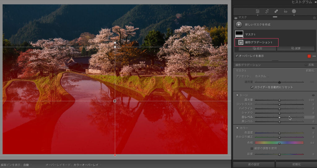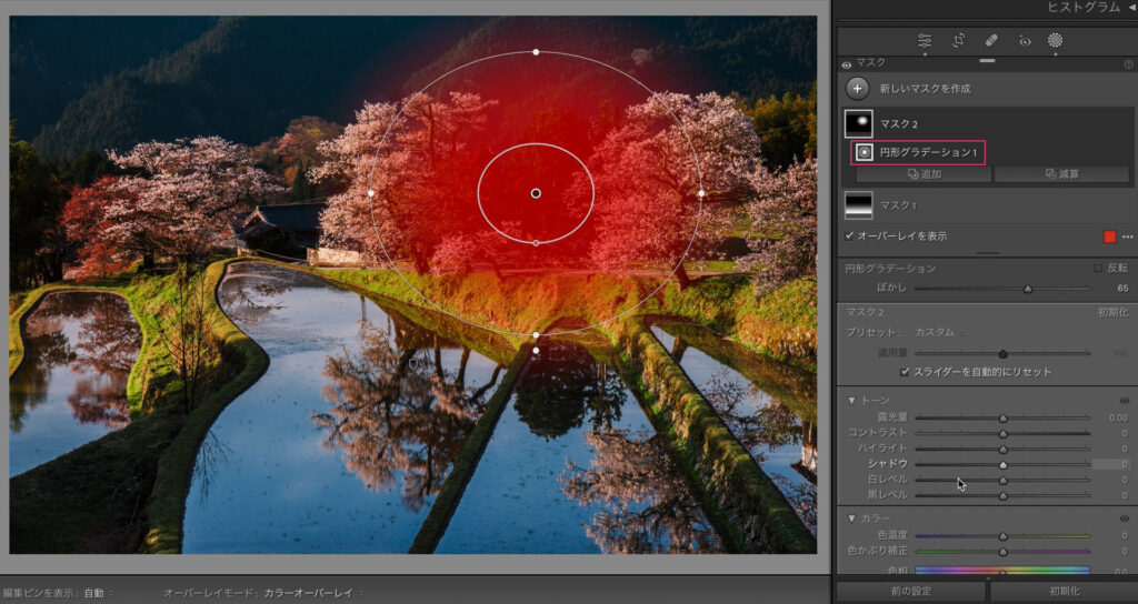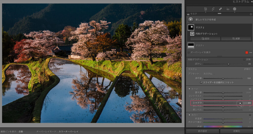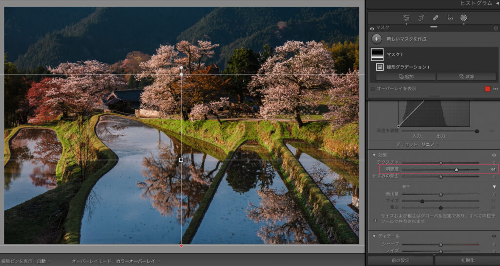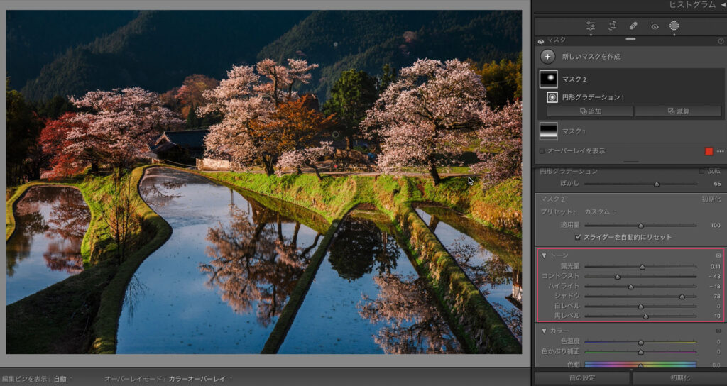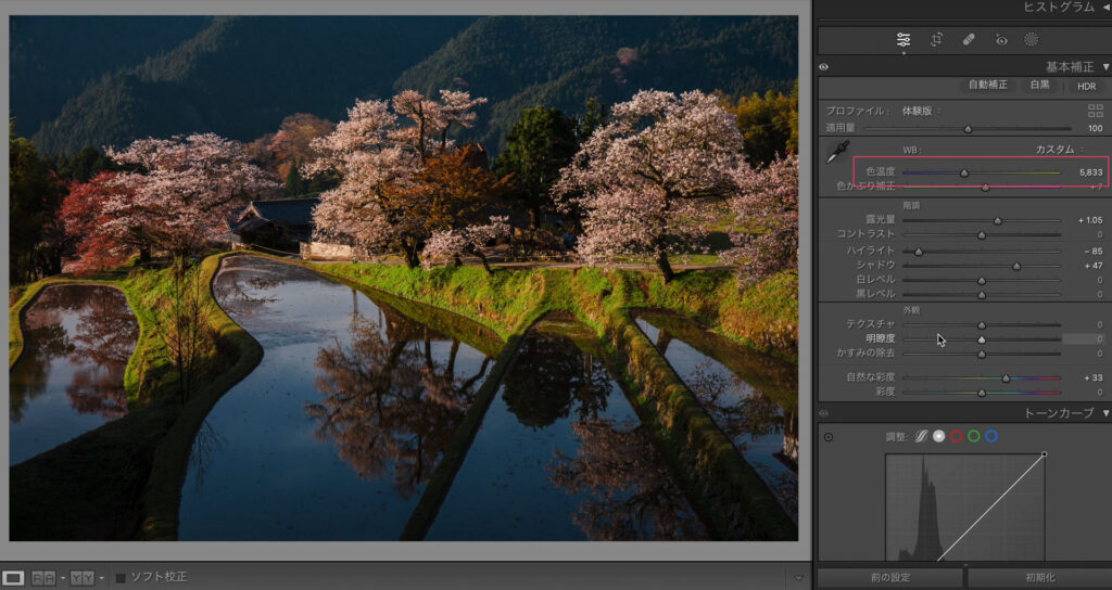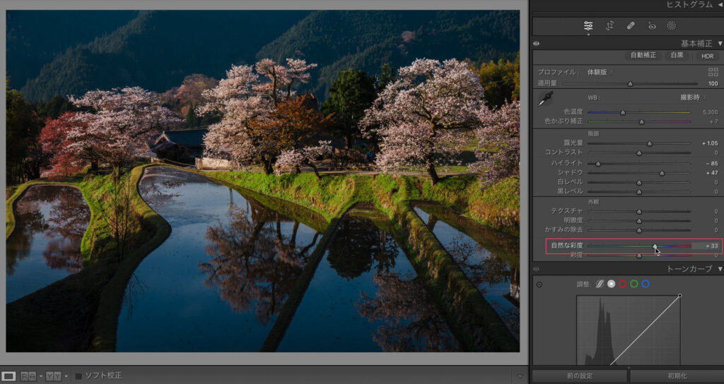 自然な彩度で鮮やかにします。ここまでが現像の土台作りです。