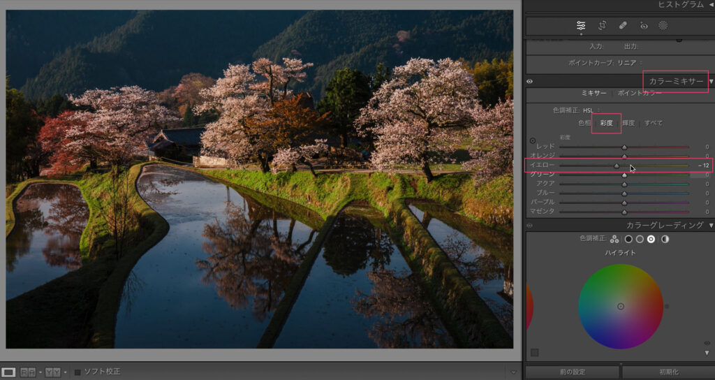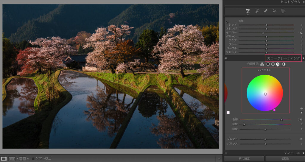 もう少し桜を際立たせたいので、カラーグレーディングのハイライトを若干マゼンタに寄せます。