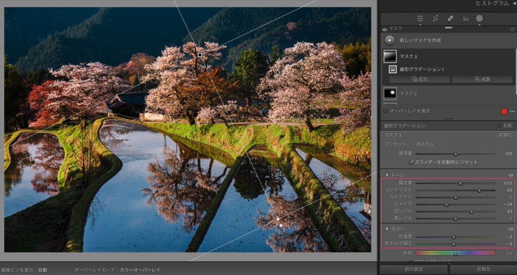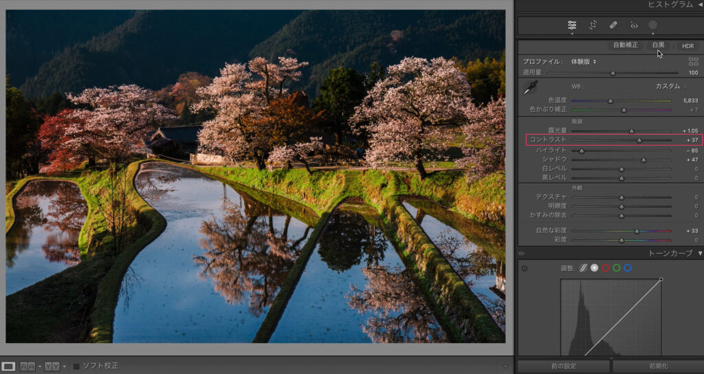 そうすることで青みが抑えられます。同時に朝日に照らされた桜の暖色が強調されました。
