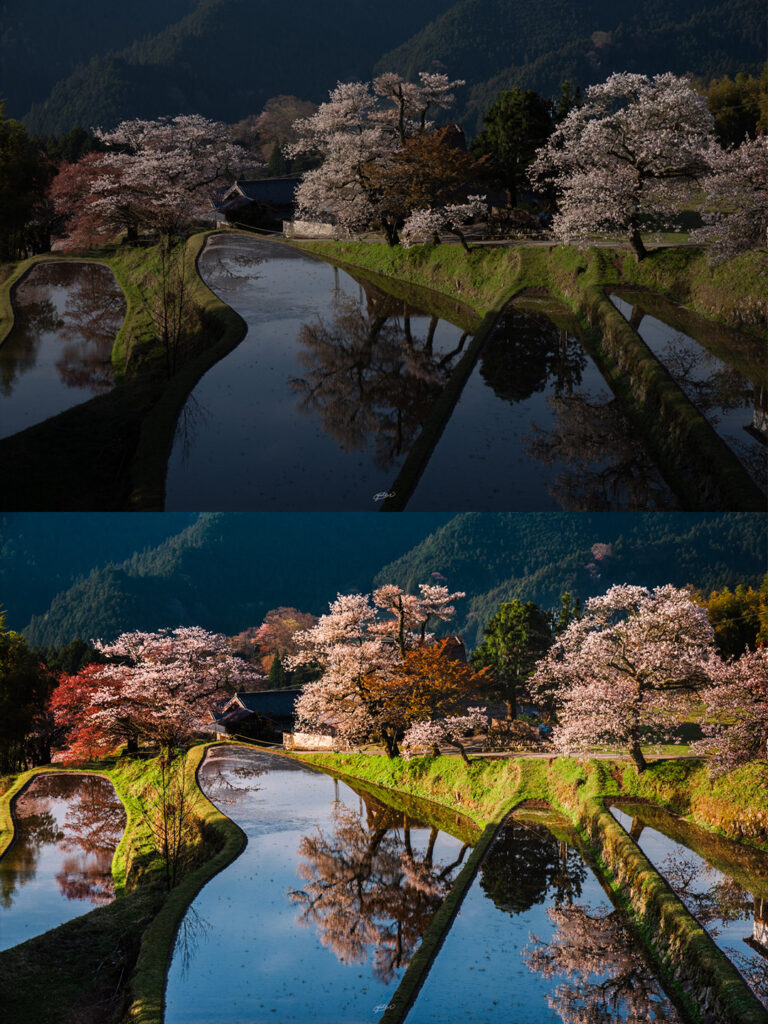 これがBefore Afterです。桜に綺麗に色が乗ったのは朝日の暖色光ならでは。